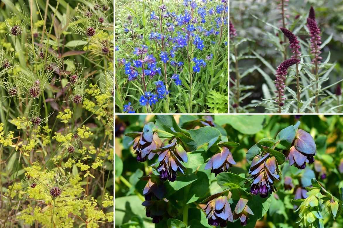Un exemple d’association en terre bien drainée : Allium ‘Hair’ et Euphorbe seguieriana ssp. niciciana, Anchusa azurea ‘Loddon Royalist’, Lysimachia atropurpurea ‘Beaujolais’ et Cerinthe major