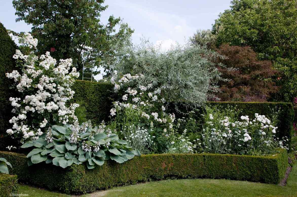 Un exemple d’association dans un jardin blanc : rosier ‘Maria Mathilda’, Pyrus salicifolia ‘Pendula’, Hosta sieboldiana var elegans, Buxus sempervirens, Lychnis coronaria ‘Alba’, rosier ‘Guirlande d’Amour’, Camassia leichtlinii blanc, Centranthus ruber ‘Albus’, Orlaya grandiflora…