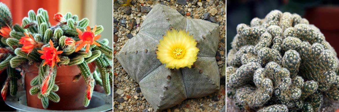 Les cactus peuvent prendre des formes variées : Echinopsis chamaecereus, Astrophytum myriostigma et Mammillaria elongata ‘Cristata’ (photos 2 et 3: Resenter1 / David J. Stang)