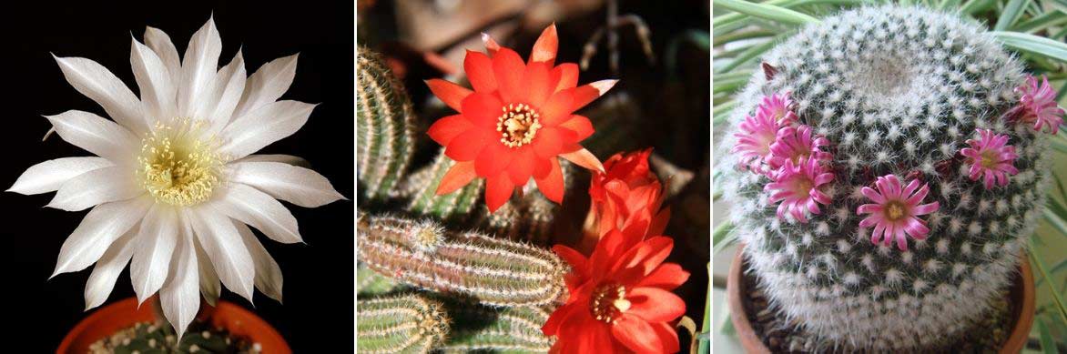 Les cactus offrent en général de belles et grandes fleurs colorées, avec de nombreux pétales. En général elles sont solitaires et bisexuées. Leurs couleurs sont souvent claires et vives : jaune, rose, rouge, orangé… parfois blanches. De nombreuses espèces de cactus ont des fleurs nocturnes, s’ouvrant la nuit. Les floraisons sont surprenantes, grandes par rapport à la taille du cactus.