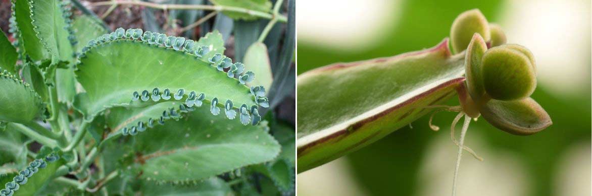 Certaines plantes grasses, et notamment le Kalanchoe daigremontiana, produisent sur leurs feuilles des bulbilles : il s’agit de petites plantules accrochées en bordure du limbe, formant de petites feuilles et racines. En grandissant, elles se détachent et tombent sur le substrat où elles peuvent s’enraciner. Il est donc très facile de multiplier ces plantes en prélevant les bulbilles et en les replantant dans du substrat.