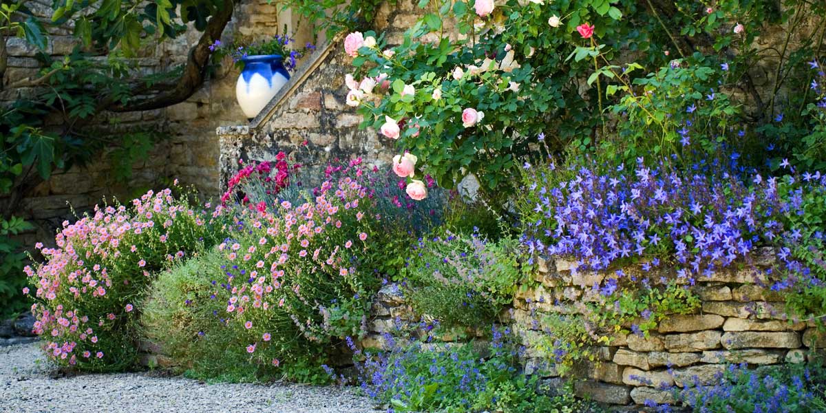 Vous pouvez composer une belle scène minérale en associant une campanule de rocaille au rosier ‘Pierre de Ronsard’, Helianthemum ‘Lawrenson’s Pink’, Nepeta racemosa ‘Grog’ et Dianthus ‘Romeo’ (photo E. Gonnet – Biosphoto)