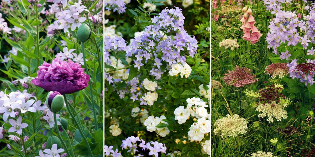 Campanule ‘Loddon Anna’ et pavot ‘Purple Peony’ (photo Fiona Lea – GAP) / Campanula lactiflora et Rosa ‘Opalia’ (photo Pernilla Bergdahl – GAP) / Daucus carota ‘Dara’, Digitale et Campanula lactiflora