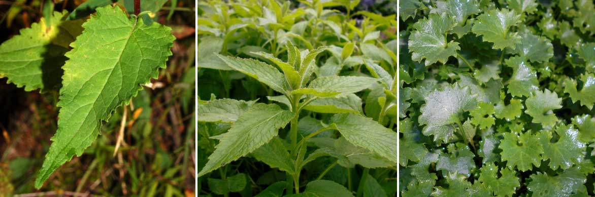 Les feuilles de quelques campanules : Campanula rapunculoides (photo Hectonichus), Campanula latifolia (photo Salicyna) et Campanula portenschlagiana (photo Salicyna)