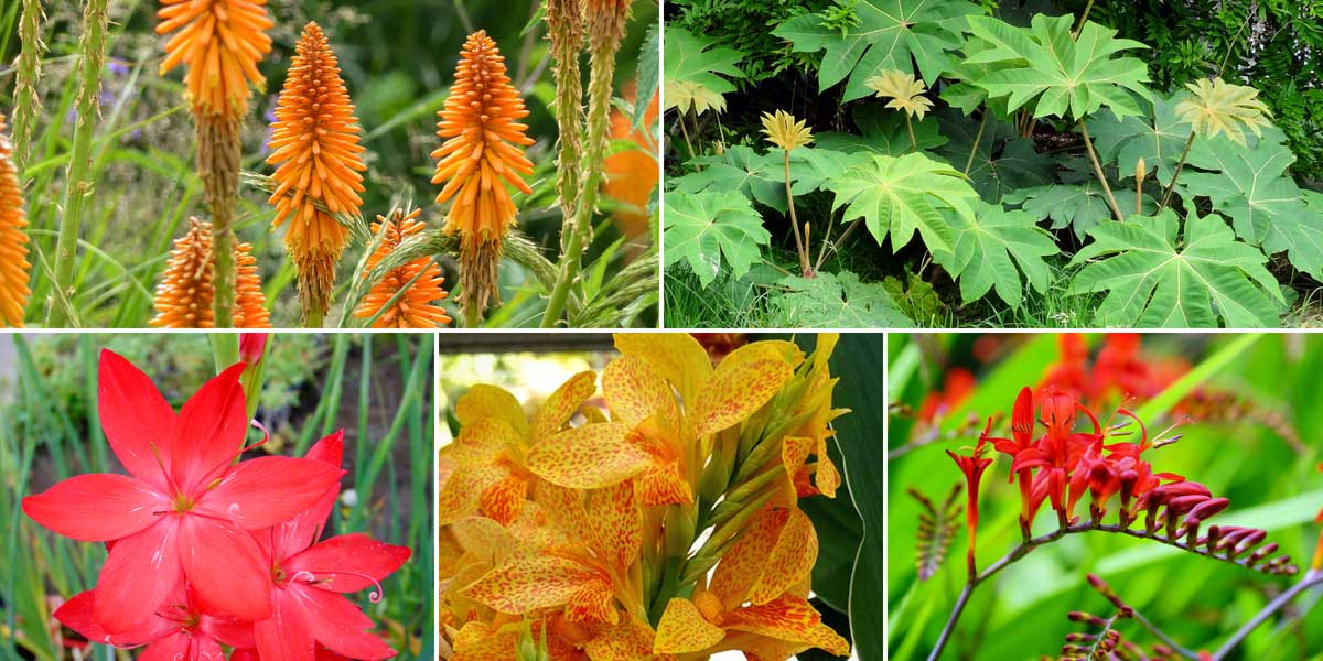 Une idée d’association pour un jardin exotique : Kniphofia ‘Fiery Fred’, Tetrapanax papyrifera ‘Rex’, Schizostylis coccinea ‘Major’, Canna ‘Picasso’ et Crocosmia