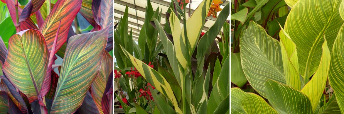 Les cannas offrent de superbes feuillages, assez différents suivant les variétés ! Dans l’ordre, Canna ‘Durban’, Canna ‘Stuttgart’ et Canna ‘Striata’