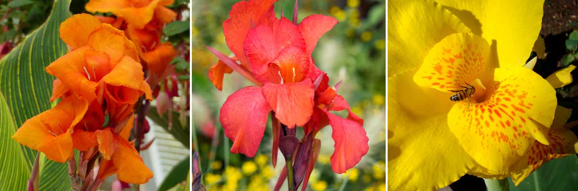Les cannas fleurissent souvent dans des teintes vives et chaleureuses ! Canna ‘Striata’, Canna ‘Red King Humbert’, et Canna ‘Yellow Humbert’ (photo Mauroguanandi)