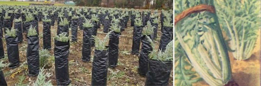 - d’entourer l’ensemble d’un manchon de paille, d’un carton, de toile, de journal, de plastique noir, ou de tout autre film opaque, de façon à ce que la lumière ne pénètre plus dans la touffe : privées de lumière, les feuilles vont s’attendrir et blanchir
