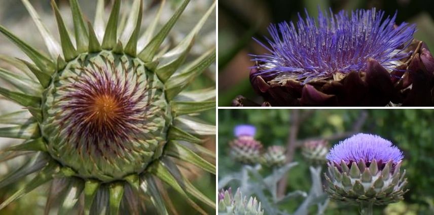 En juin-juillet de la seconde année de culture, la floraison aux allures de chardons émerge de cette touffe imposante de grandes feuilles. Elle apparaît en gros capitules solitaires portés au sommet des tiges ramifiées, robustes et rameuses. Ces corolles en forme d’ampoule sont composées de plusieurs rangées de poils plumeux de couleur indigo à violet logés dans un réceptacle charnu et écailleux fait de bractées d’involucres coriaces, épineuses ou non. Ces boutons de fleurs qui ressemblent à des mini-artichauts de 5 cm de diamètre sont comestibles.