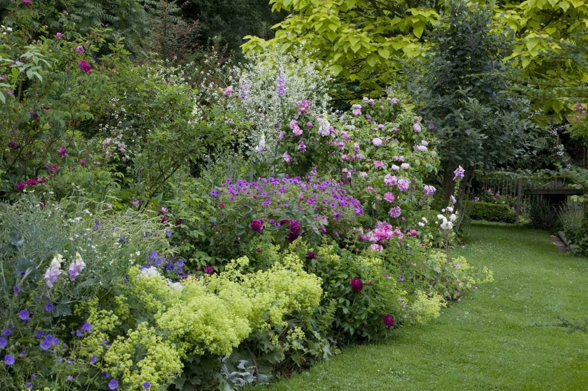 Un exemple d’association dans un jardin champêtre : des Géraniums vivaces dont ‘Patricia’, Digitalis purpurea, Crambe cordifolia, Rosiers dont Rosa versicolor et Alchemilla mollis dont la couleur répond à celle du Catalpa bignonioïdes ‘Aurea’ en arrière-plan