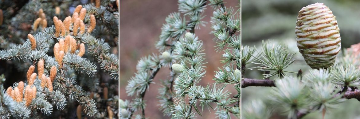 Cedrus deodara conserve un port pyramidal aux branches légèrement pleureuses et montre des aiguilles plus souples et longues que les autres cèdres, mesurant de 3,5 à 5 cm. La couleur bleutée des aiguilles est typique du Cedrus atlantica forma glauca, appelé encore cèdre bleu. Cette forme très sollicitée dans nos jardins possède un port un peu plus souple que l’espèce type à aiguilles vert sombre. Le cèdre du Liban a des aiguilles de longueur intermédiaire qui mesurent 3 à 3,5 cm puis vient le cèdre de l’Atlas avec une longueur comprise entre 2 et 2,6 cm, suivi du cèdre de Chypre avec une moyenne de 1,2 cm, comme son nom latin l’indique brevifolia qui signifie « à feuilles courtes ». Les jeunes rameaux sont duveteux, hormis chez Cedrus libani qui a des pousses presque glabres. L’écorce d’abord grise et lisse chez les jeunes sujets, prend au fil des ans un aspect plus fissuré et écailleux.