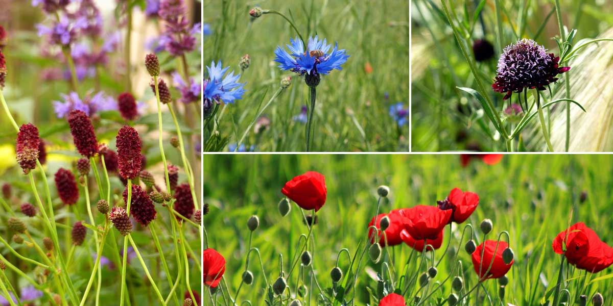 Le bleuet trouve facilement sa place dans un jardin naturaliste ! Sanguisorbe ‘Red Thunder’, bleuets, Scabiosa atropurpurea ‘Chile Black’ et coquelicots