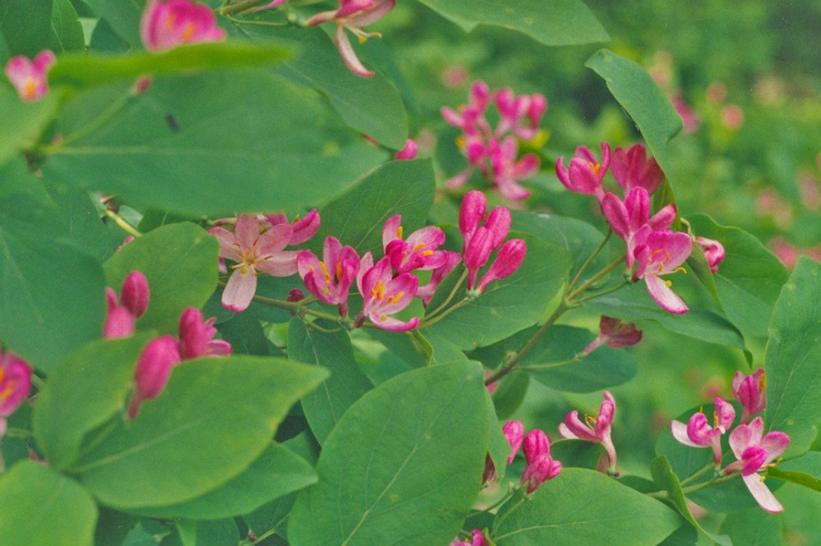 Le chèvrefeuille de Tatarie, Lonicera tatarica souffre d’une méconnaissance du genre car il produit une abondante floraison rose violacé, rouge pourpré chez ‘Hack’s Red’. Ce buisson originaire du Caucase possède d’assez grandes feuilles vert intense au revers bleuté sur lequel se détachent une multitude de petites fleurs, pas tout à fait régulières (zygomorphes), à tube prolongé par 5 pétales. Les 5 étamines orange illuminent l’intérieur des pétales légèrement plus clair que l’extérieur.
