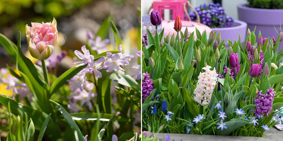 Les chionodoxas se marient à merveille avec les bulbes printaniers ! Chionodoxa forbesii Pink Giant et Tulipe (photo Steven Bemelman – iBulb) / Chionodoxa luciliae, Tulipes, Jacinthes et Muscaris (photo F-Studio – iBulb)
