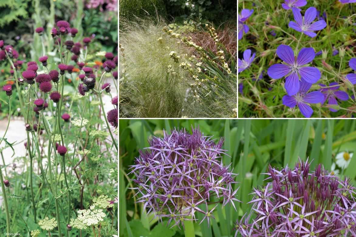 Une idée d’association naturelle : Cirsium rivulare ‘Atropurpureum’, Selinum wallichianum, Stipa tenuifolia et Sisyrinchium striatum, Geranium ‘Nimbus’, Allium christophii