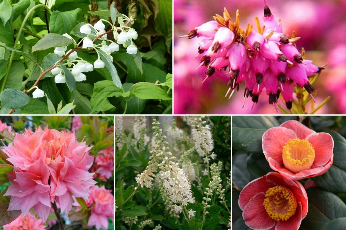 Une idée d’association pour des floraisons une bonne partie de l’année : Clethra alnifolia, Azalée de Chine ‘Kilian’, Camellia ‘Sanpei Tsubaki’, Zenobia pulverulenta ‘Blue Sky’ et Erica x darleyensis ‘Eva Gold’ en couvre-sol