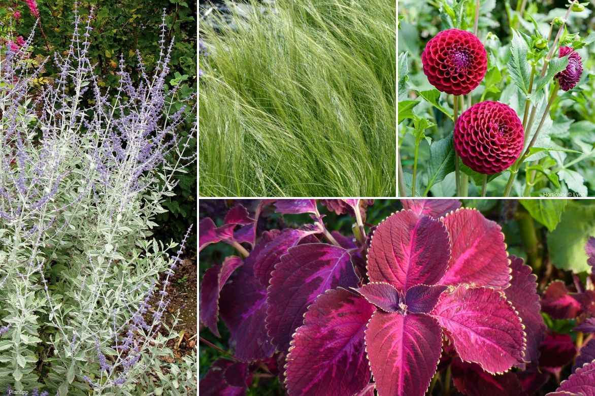 Une idée d’association en massif : Perovskia comme ‘Little Spire’, Stipa tenuifolia, Dahlia balle ‘Ivanetti’ et Coleus ‘Kingwood of Torch’ ou un plus foncé comme ‘Black Prince’ conviendrait très bien aussi