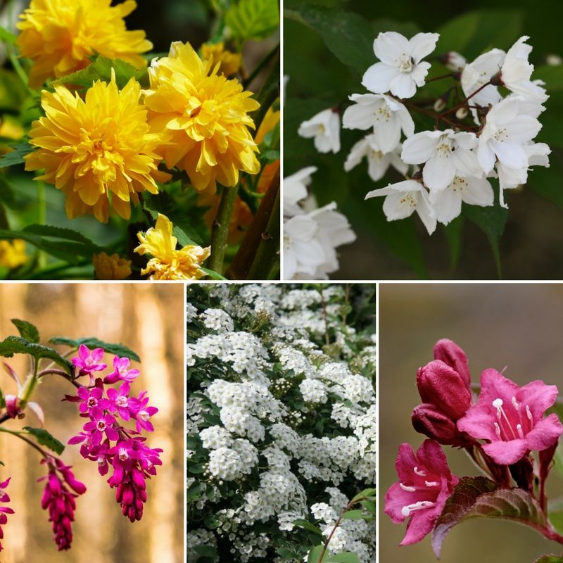 Un exemple d’association en haie libre : Kerria japonica ‘Pleniflora’, Deutzia rosea ‘Campanulata’, Ribes sanguineum ‘King Edward VII’, Spirea nipponica ‘Snowmound’, Weigelia ‘Bristol Ruby’.