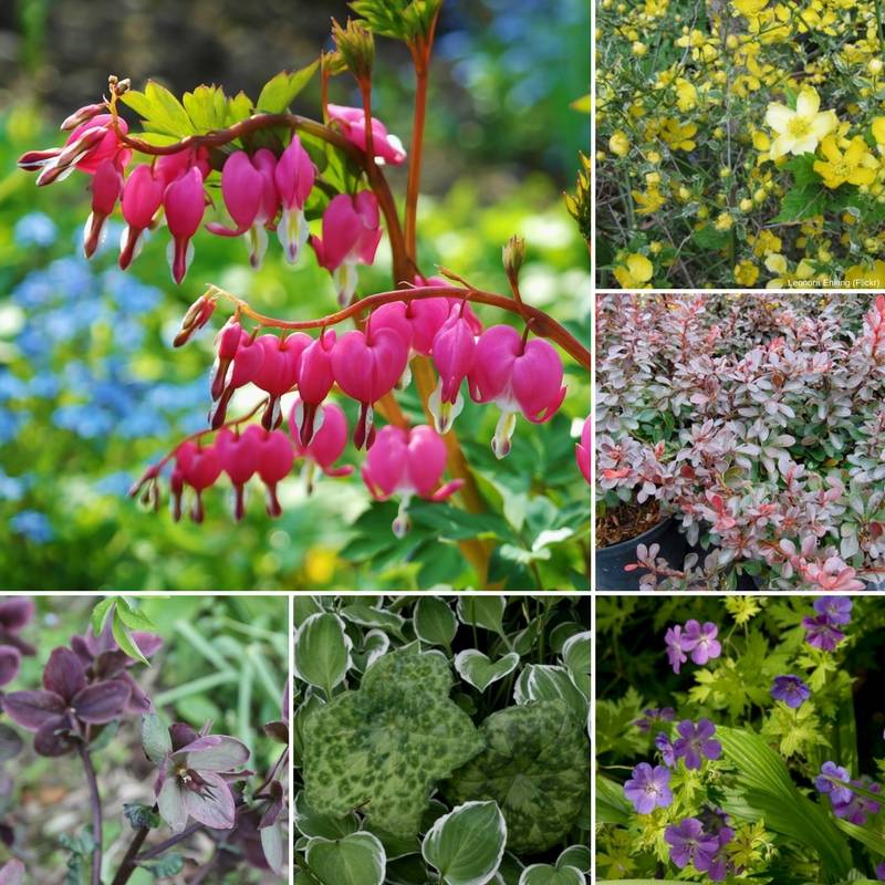 Une idée d’association printanière : Dicentra spectabilis, Kerria japonica ‘Picta’, Berberis thunbergii ‘Atropurpurea Nana’, fleurs fanées mais non moins décoratives d’Helleborus orientalis, Podophyllym ‘Spotty Dotty’ et Hosta ‘Silver Crown’, Geranium ‘Blue Sunrise’.