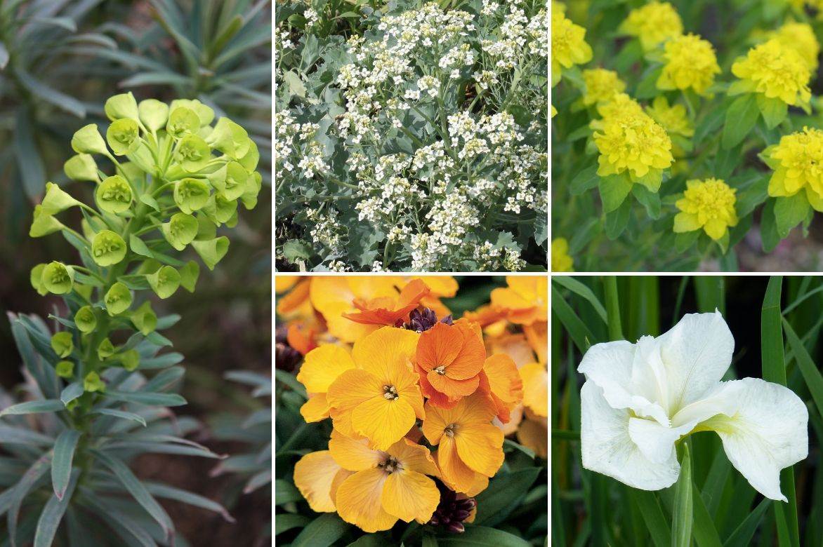 Une idée d’association dans un camaïeu de jaune-vert acidulé, d’orangé et de blanc : Euphorbia characias ssp wulfenii, Crambe maritima, Euphorbia polychroma, Erysimum ‘Rysi Copper’ et Iris sibirica ‘Snow Queen’