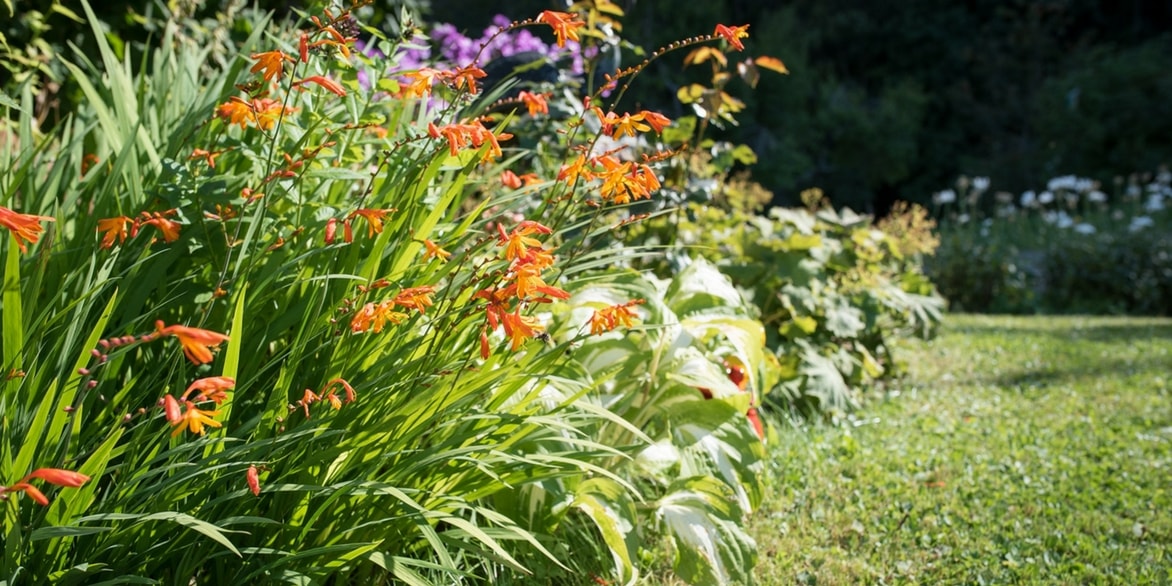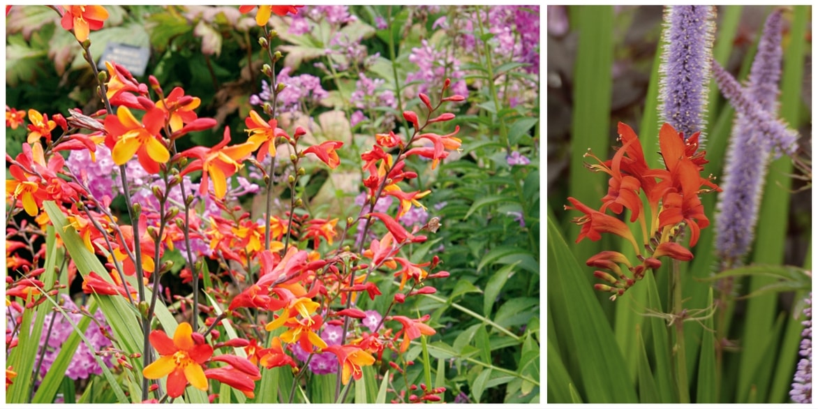 Les feuilles élancées et la floraison aérienne du Crocosmia le rendent assez graphique et lui permettent d’apporter du volume à un massif plat ou aux lignes formelles. Il peut ainsi créer un bel effet de contraste à côté de plantes taillées de façon plus stricte. Vous pouvez aussi l’associer à des plantes aux floraisons blanches, qui adouciront les couleurs vives du Crocosmia.