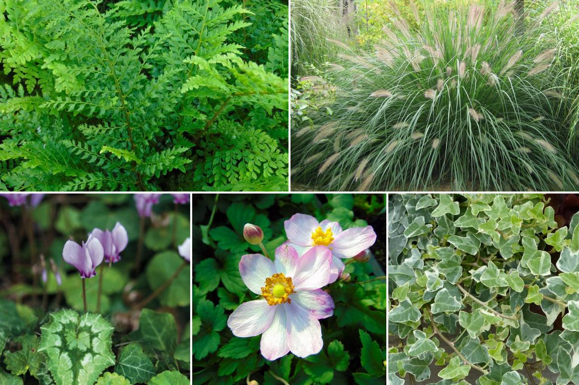 Un exemple d’association dans un grand pot : Polystichum setiferum ‘Proliferum’, Pennisetum alopecuroides ‘Gelbstiel’, Cyclamen hederifolium, Anemone japonica ‘Fantasy Cinderella’, Hedera helix ‘Mini Ester’.