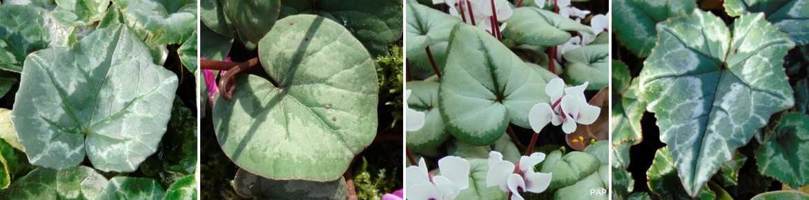Les feuillages des cyclamens sont très décoratifs : Cyclamen hederifolium ‘Album’, Cyclamen coum, Cyclamen coum ‘Silver White’, Cyclamen neapolitanum.
