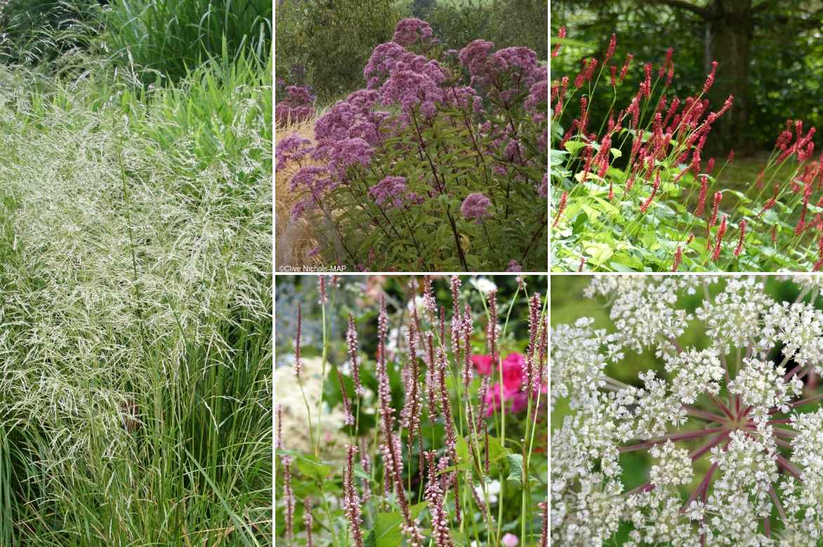 Une idée d’association : Deschampsia cespitosa ‘Goldschleier’, Eupatorium maculatum ‘Atropurpureum’, Persicaria amplexicaulis ‘Firetail’ (ou ‘Caliente’, ‘Black Field’, ‘Fat Domino’…), Persicaria amplexicaulis ‘Rosea’ et Selinum wallichianum