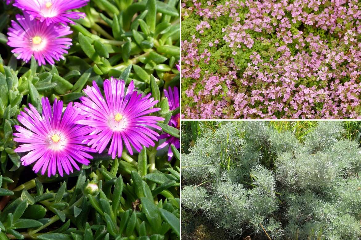 Une idée d’association en situation ensoleillée et sèche : Delosperma cooperi, Thymus serpyllum ‘Minimus’ et Artemisia canescens (photo Peganum)