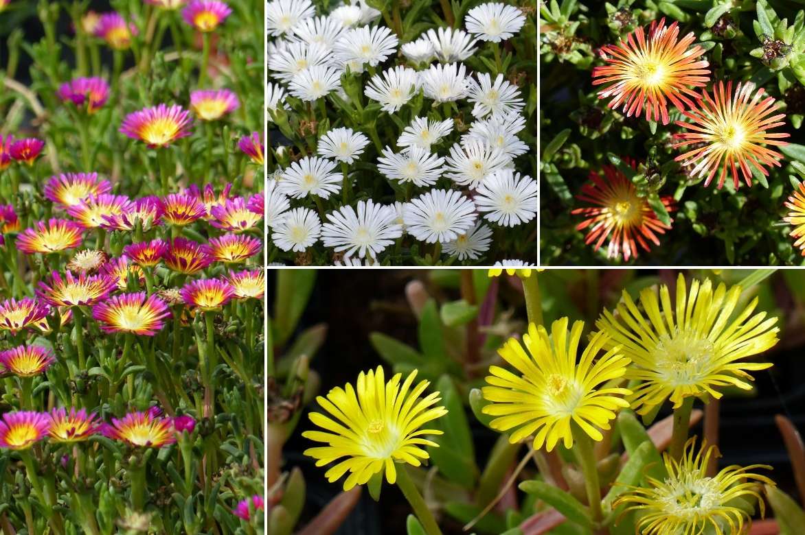 Plusieurs couleurs de fleurs : Delosperma Wheels of Wonders Hot Pink, Delosperma Wheels of Wonder White, Delosperma Wheels of Wonder Fire, Delosperma Wheels of Wonder Golden