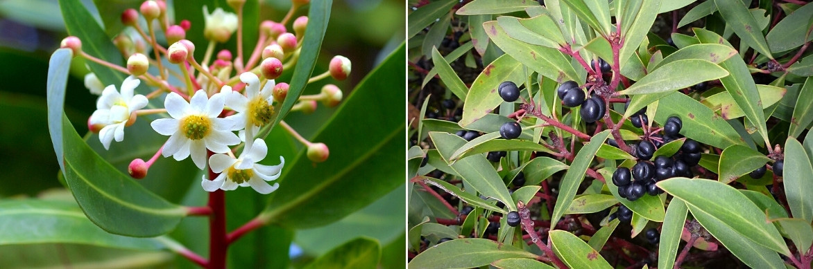 - Les rameaux rouges du Drimys aromatica créent un joli contraste avec le vert de ses feuilles