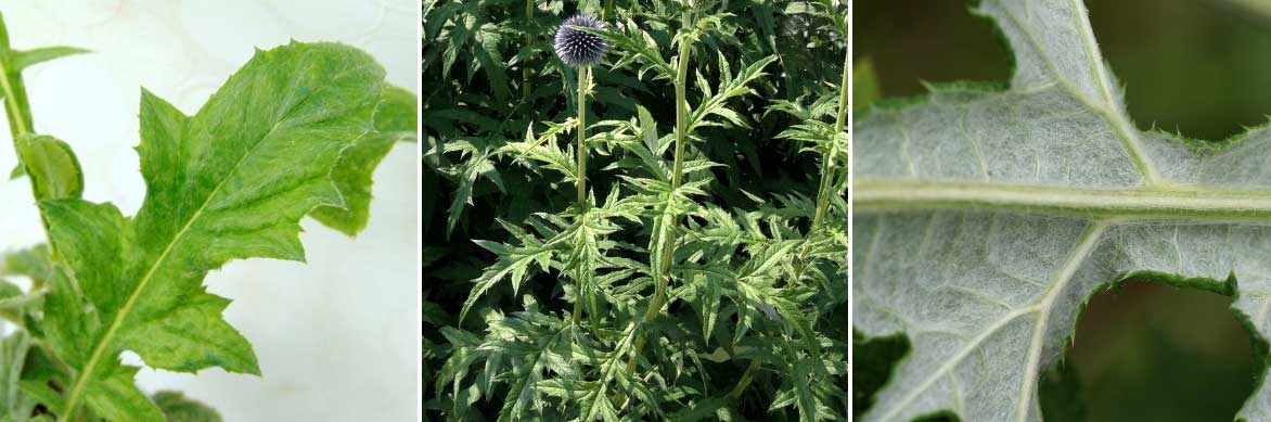 Une feuille d’Echinops bannaticus, le feuillage de l’Echinops sphaerocephalus (photo Lucy Downey) et le revers d’une feuille d’Echinops exaltatus (photo Rolf Engstrand)