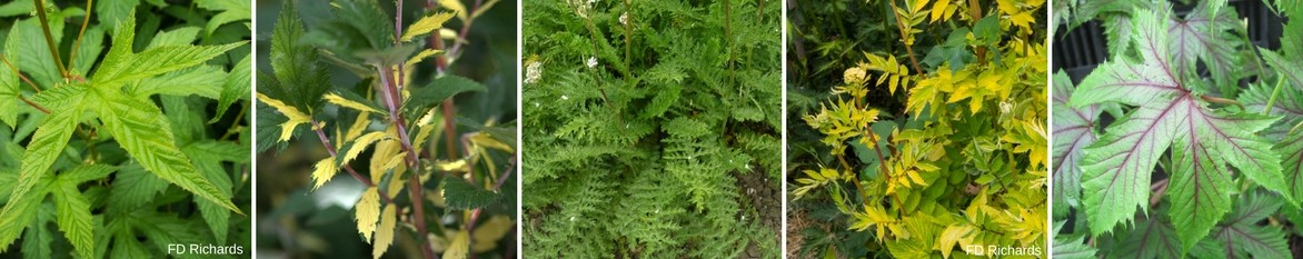 Leur couleur oscille du vert franc au vert foncé. Chez la Filipendula rubra, les jeunes feuilles sont pourpres au printemps. Chez ‘Variegata’, le feuillage vert, se panache de jaune d’or au centre de la feuille, chez ‘Aurea’ il passe par de nombreuses nuances de vert tendre et de vert citron au cours de la saison. Filipendula ‘Red Umbrellas’ porte de grandes feuilles vertes parcourues de nervures très graphiques pourpre foncé.