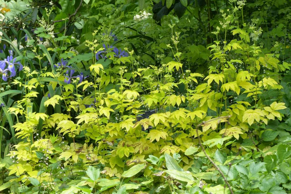 Le feuillage doré de la Filipendula ulmaria ‘Aurea’ permet d’éclairer un coin ombragé du jardin.
