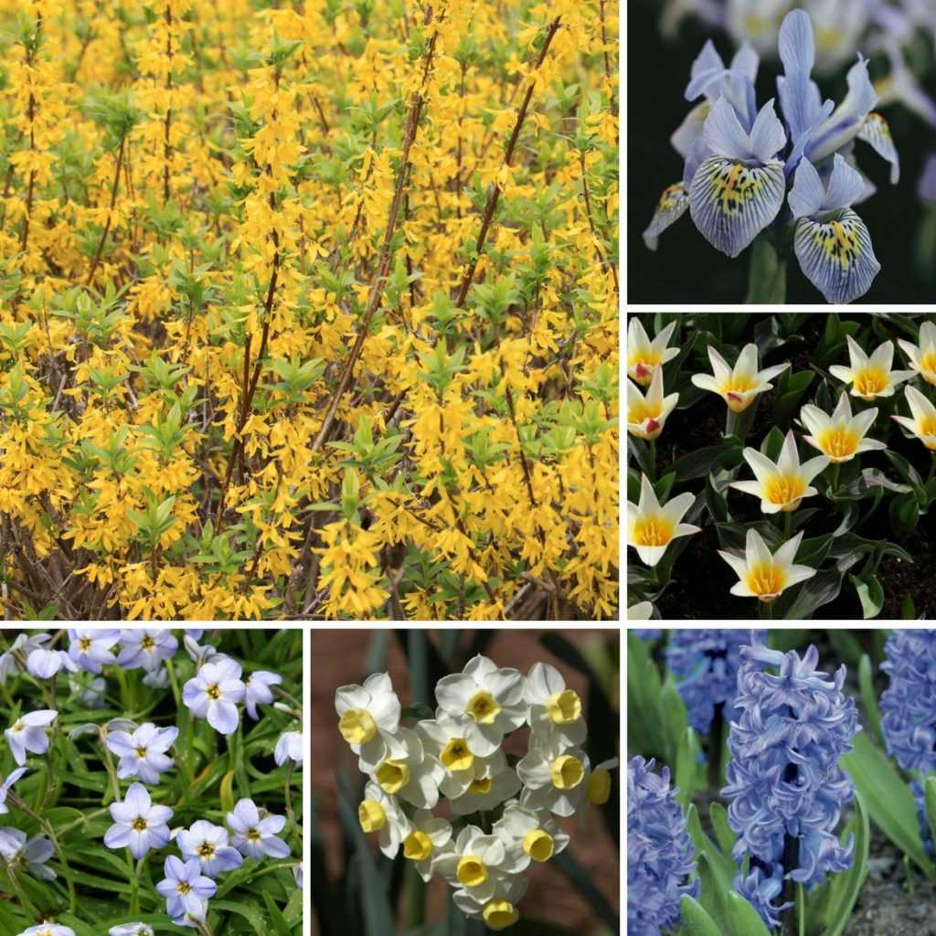 Une association jaune d’or et bleu avec le forsythia Citrus Swizzle et, de haut en bas, l’iris reticulata Kathrina Hodgking, des tulipes botaniques kaufmanniana Johann Strauss, la jacinthe Delft Blue, les narcisses New Baby et l’Ipheion Rolf Fiedler.