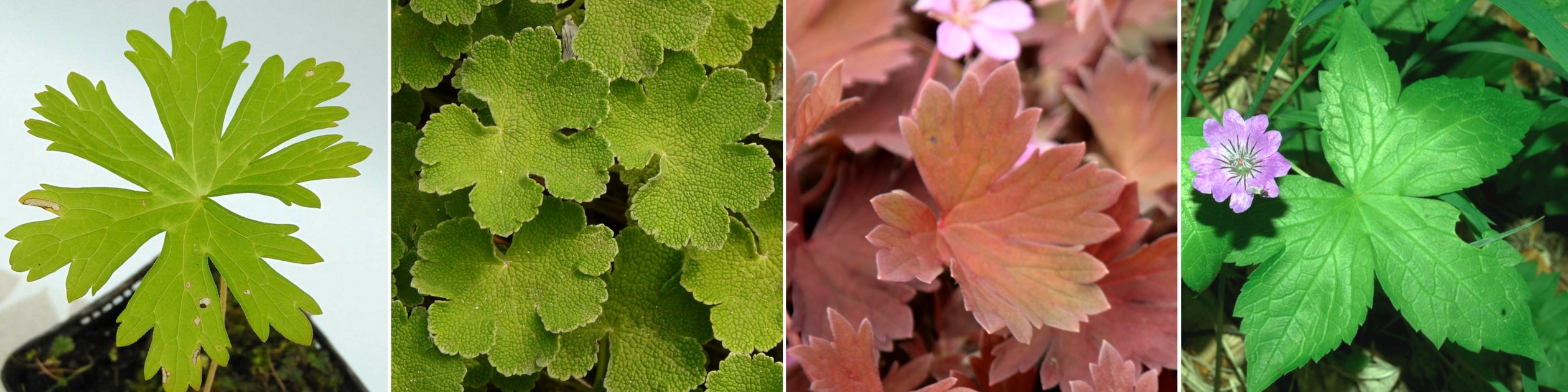 La diversité du feuillage des géraniums ! De gauche à droite : Geranium maculatum, Geranium renardii, Geranium ‘Bob’s Blunder’ et Geranium nodosum (photo Benjamin Zwittnig)