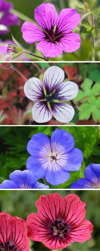 Les géraniums offrent une belle gamme de couleurs ! De haut en bas : Geranium ‘Patricia’, Geranium ‘Salomé’, Geranium ‘Rozanne’ et Geranium cinereum ‘Jolly Jewel Salmon’