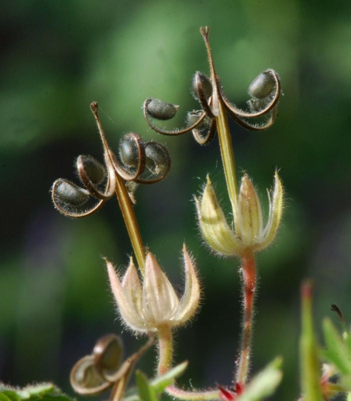 Les fruits du géranium, très fins et allongés, ont la forme d’un bec de grue. Ils sont surprenants car à maturité, un système de tension leur permet d’éjecter subitement, à quelques dizaines de centimètres, les cinq graines qu’ils portent !