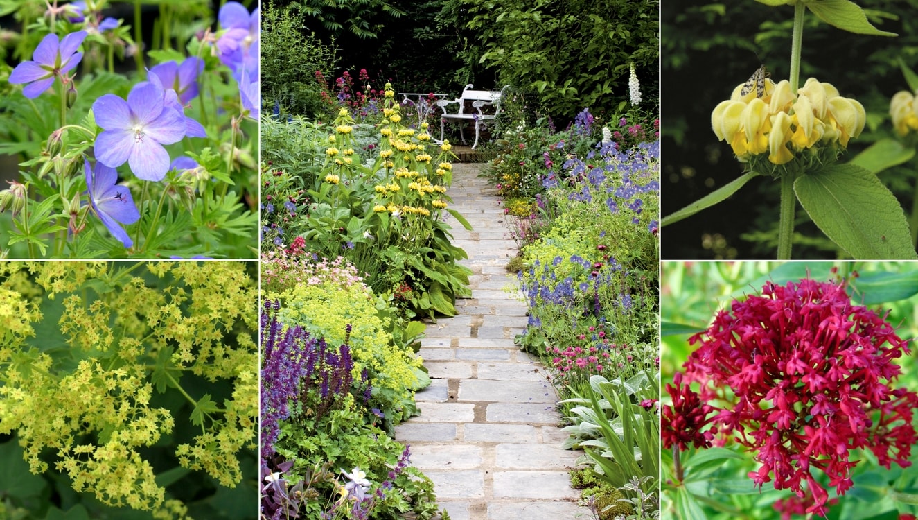 Une scène colorée en bordure de chemin avec Geranium ‘Johnson’s Blue’, Alchemilla mollis, Phlomis russeliana et Centranthus ruber (copyright GAP Photos Elke Borkowski)