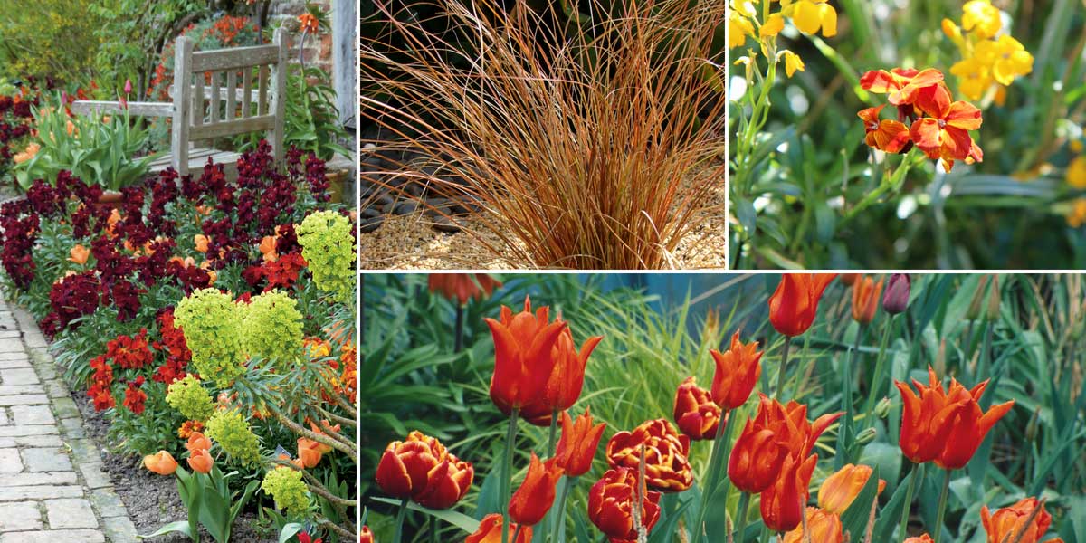 Une idée d’association dans des tons chauds. Euphorbia characias ‘Wulfenii’, Erysimum ‘Bedder Scarlet’, Erysimum ‘Bedder Vulcan Brune’ et tulipes / Carex comans / Erysimum cheiri / Tulipes ‘Ballerina’, ‘Allegretto’ et ‘General de Wet’ (photo Clive Nichols – The Nichols Garden – MAP)