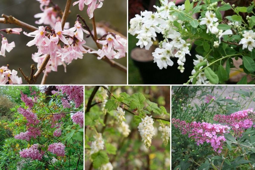 Un exemple d’association dans une haie très “girly” pour une floraison étalée de février à septembre : Abeliophyllum distichum ‘Roseum’ – Exochorda macrantha ‘The Bride’ – Syringa microphylla ‘Superba’ – Ribes sanguineum ‘White Icicle’ – Buddleia davidii ‘Pink Delight’