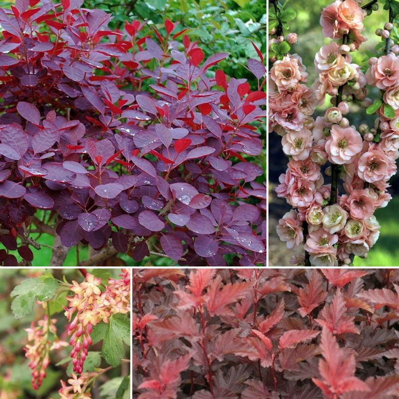 Un exemple d’association en haie pourpre et saumoné : Cotinus coggygria ‘Royal Purple’ – Chaenomeles superba ‘Cameo’ – Ribes gordonianum – Physocarpus opulifolius ‘Lady in Red’.