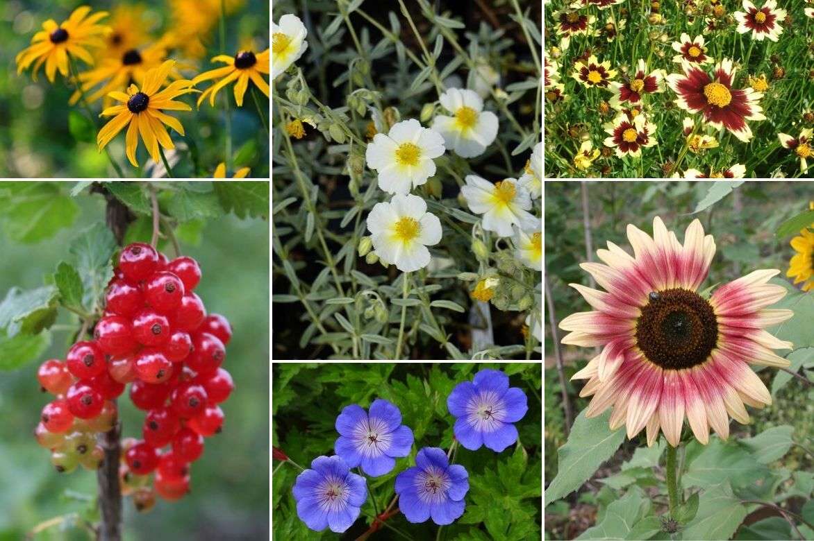Un exemple d’association au sein d’un massif en sol bien drainé : Groseillier avec des Rudbeckies comme ‘Early Bird Gold’, Helianthemum ‘The Bride’, des Géraniums vivaces ‘Rozanne’, des Coreopsis ‘Cosmic Eye’ et des Tournesols