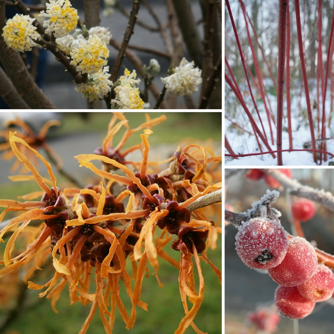 Et pour un jardin coloré en hiver, pourquoi ne pas marier l’Hamamélis (‘Jelena’) avec le sublime Edgewortha chrysantha (ou Buisson à papier), un ou plusieurs arbustes à fruits décoratifs comme le Pommier d’ornement, quelques Cornouillers à bois colorés :