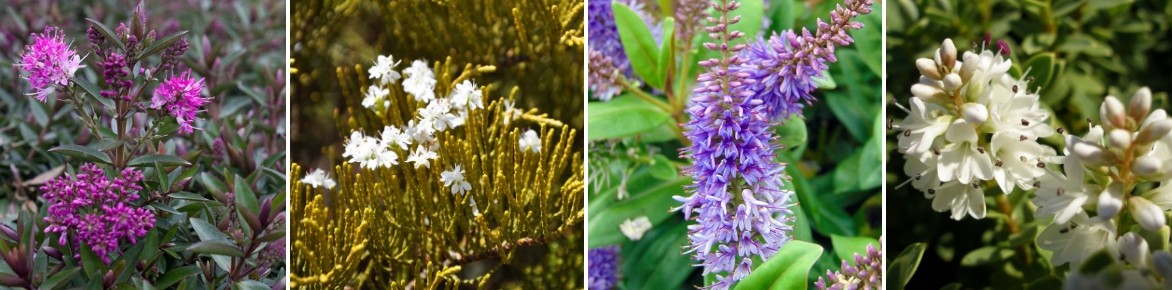 Quelques fleurs : Hebe ‘Raspberry Ripple’, Hebe ochracea, Hebe ‘Ouessant’ (photo PAP), Hebe ‘Sutherlandii’