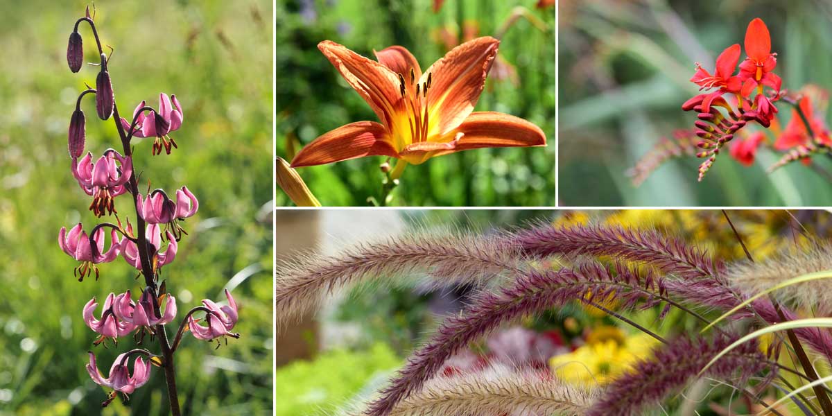 Les hémérocalles se marient très bien à d’autres floraisons colorées, en compagnie de quelques graminées ! Lys martagon, Hémérocalle, Crocosmia et Pennisetum setaceum ‘Rubrum’