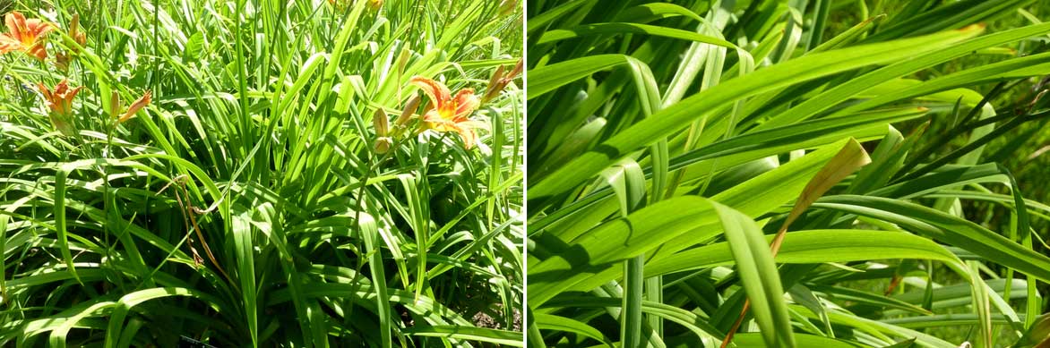 Les feuilles d’hémérocalles sont très longues et fines, lancéolées ou linéaires, et rappellent un peu le feuillage des graminées. Elles sont marquées par une nervure centrale, longitudinale. Les feuilles mesurent entre 70 cm et 1,20 m de longueur, mais parfois seulement 20-30 cm de long chez les variétés les plus petites.