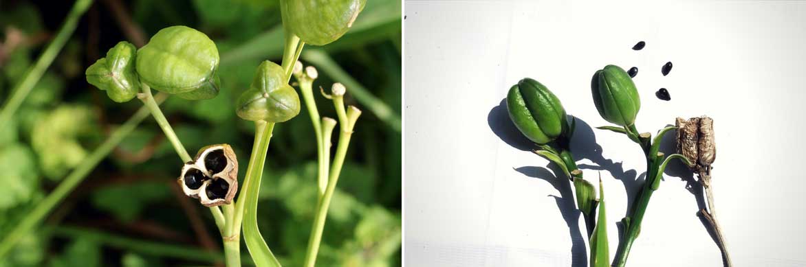 Les capsules et graines de l’Hemerocallis vespertina (photo Alpsdake) et ceux de l’Hemerocallis aurantiana (photo Yercaud-elango)