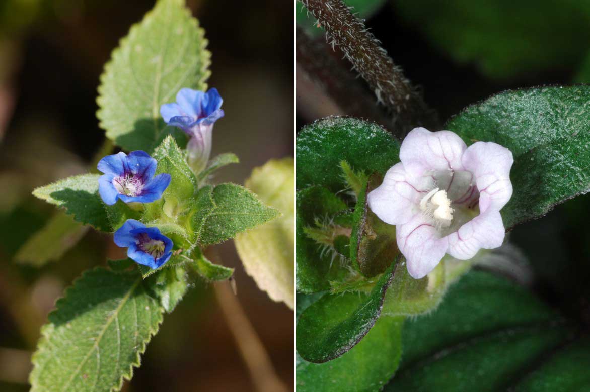 La floraison de l’Hemigraphis latebrosa (photo : Dinesh Valke) et celle de l’Hemigraphis reptans (photo : Douglas Goldman)
