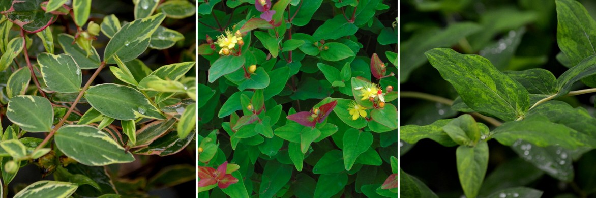Les millepertuis possèdent un feuillage très décoratif : Hypericum moserianum ‘Tricolor’, Hypericum inodorum ‘Rheingold’, Hypericum ‘Golden Beacon’